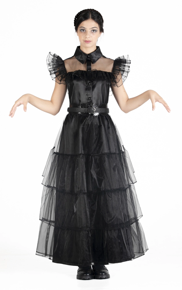 Se ud som Wednesday fra den populære Netflix serie i denne flotte balkjole. Kostumet inkluderer både en kjole og et bælte. Dette er et officielt Wednesday kostume. Str. XS = 132 cm