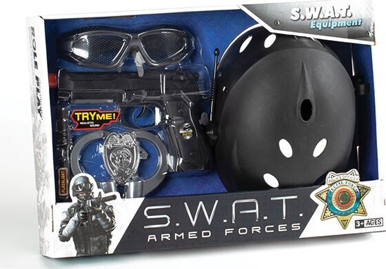 Skal du ud og fange de farlige skurke, så er det godt at have dit gir i orden. Dette super seje SWAT sæt indeholder både en smart hjelm, pistol med lyd, håndjern, skilt, briller, lygte og hjelm...