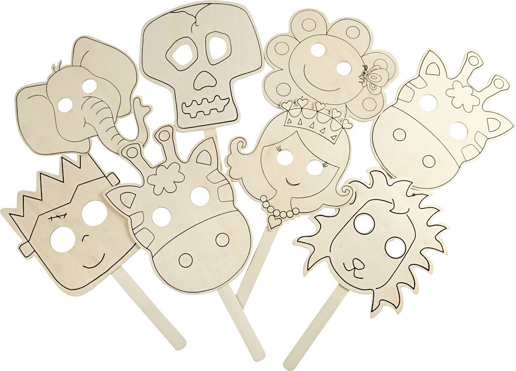 Dette er en pakke med 16 masker af træ, der kan males eller dekoreres på forskellige måder. Maskerne har udstansede huller til øjnene, og de har et håndtag, som gør det let at holde dem op foran...