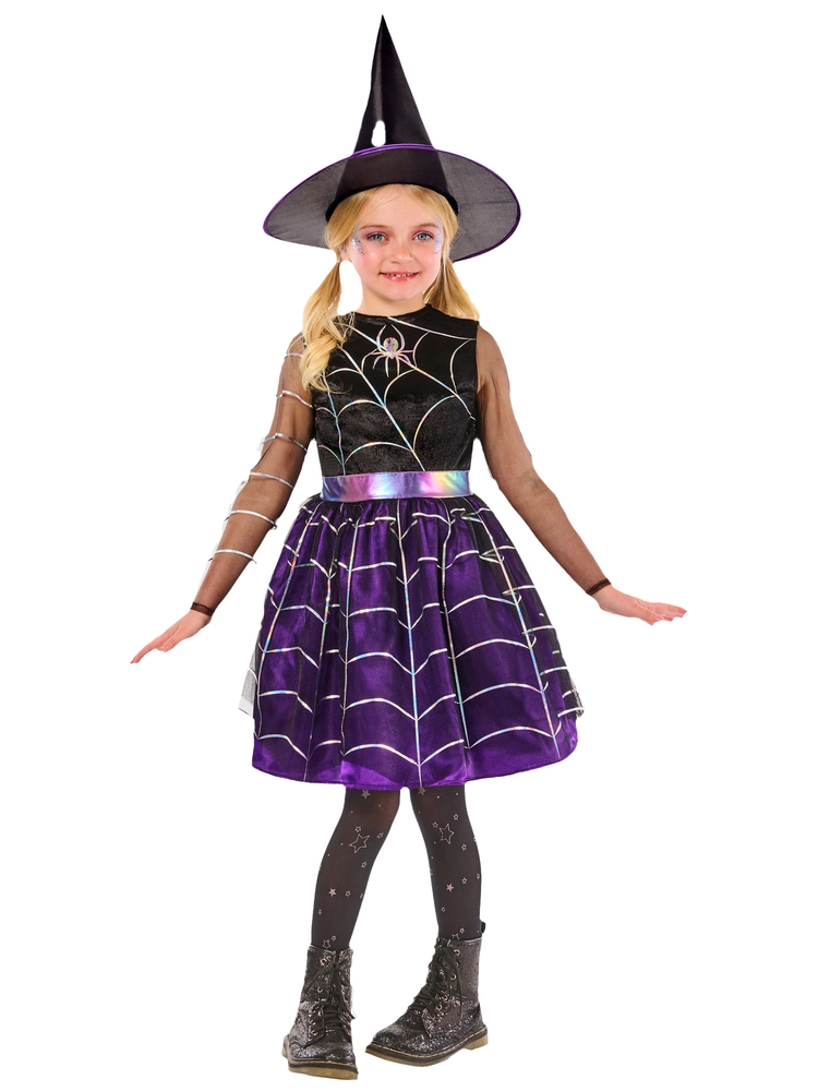 Den flotteste hekse-kjole med Edderkoppespinds tryk. Hat medfølger. Et cool look til Halloween fejringen. Str 7-8 år