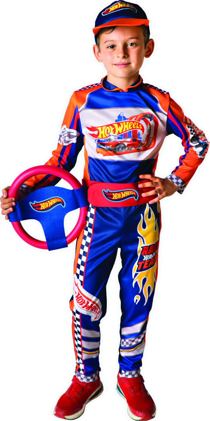 Klar til at indtage banen? Med dette seje Hot Wheels racerkørerkostume kan dit barn forvandle sig til en ægte mester bag rattet. Kostumet indeholder en flamme-mønstret heldragt med Hot Wheels...