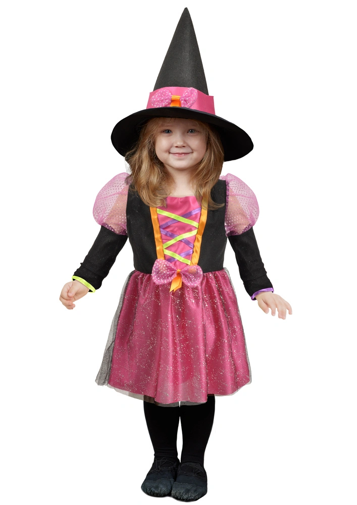 Dette søde heksekostume til børn inkluderer både kjole og hat. Perfekt til Halloween
