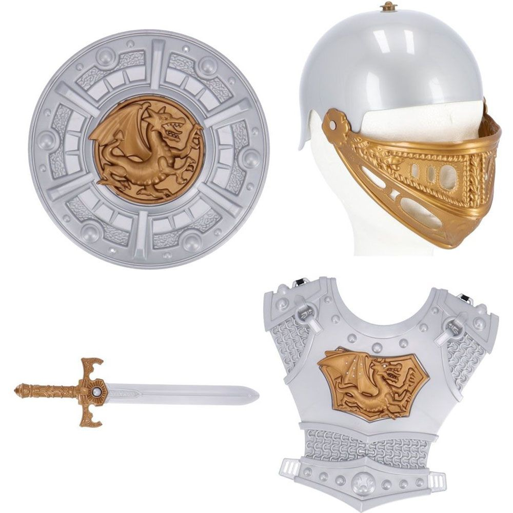 Træd ind i rollen som en ægte ridder og gør dig klar til kamp mod den farlige drage for at redde prinsessen! Dette spændende udklædningssæt indeholder alt, hvad små helte behøver: en autentisk hjelm, en brystplade, et sværd og et skjold.