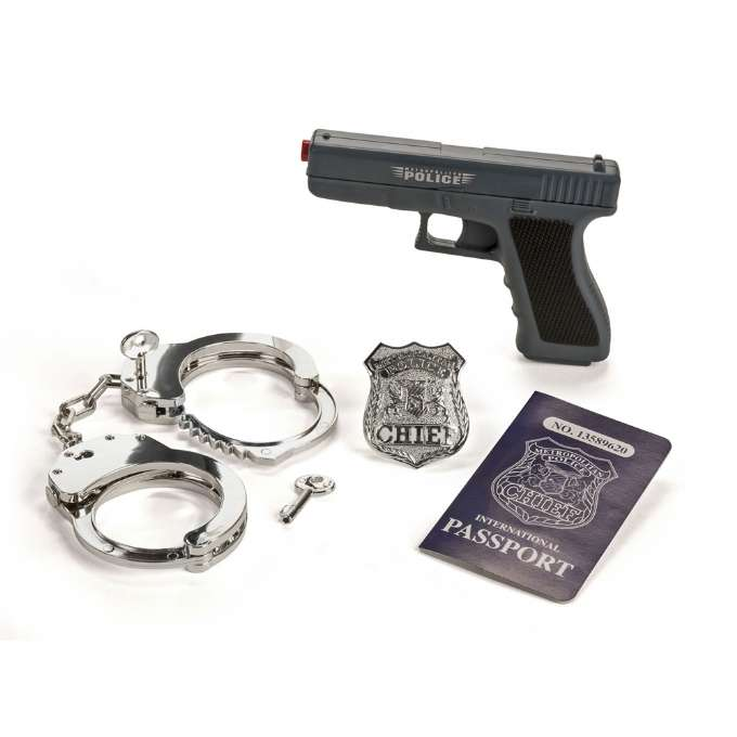 Pistol med tilbageslag, realistiske affyringslyde, håndjern, politiskilt og -pas. Inkl. 2 stk. knapcellebatterier.
