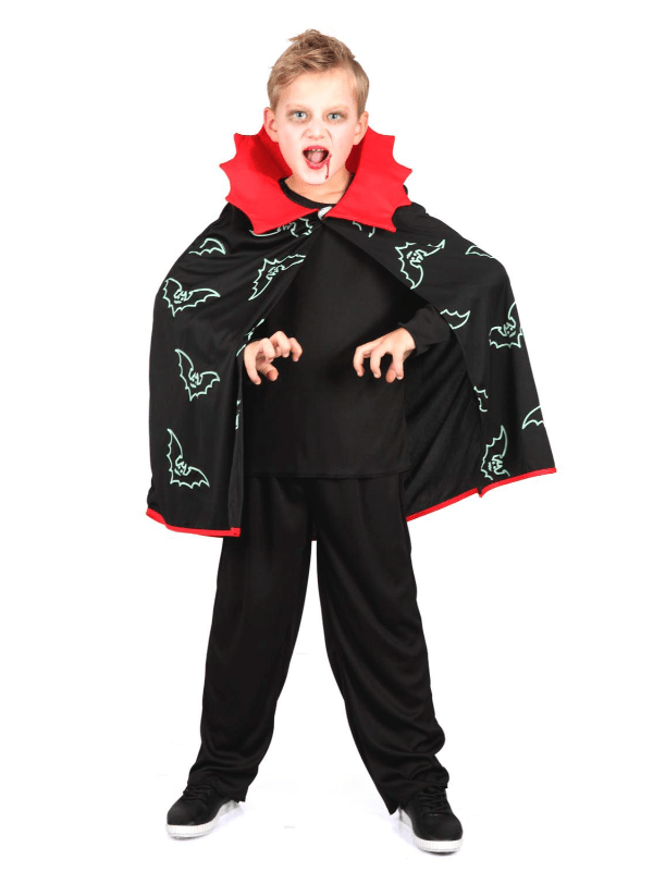 Udklędning, Selvlysende Vampyrkappe Bliv klar til Halloween med denne seje selvlysende vampyrkappe. Kappen måler 68x70 cm, passer til bųrn i alderen 5-10 år.