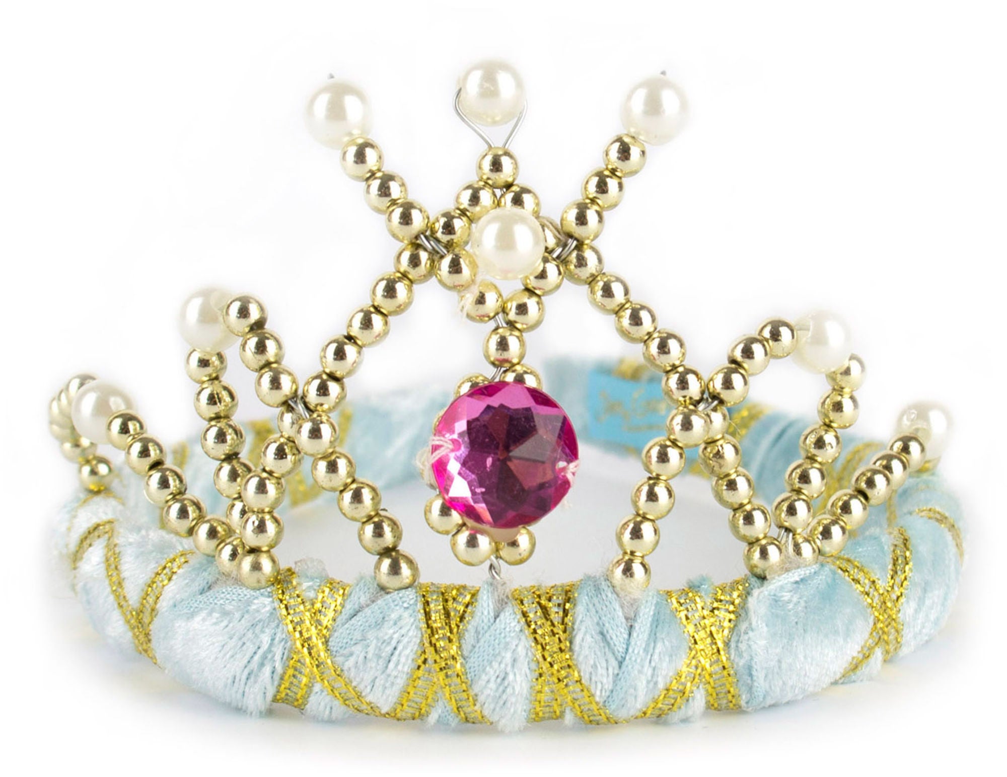 En rigtig fin tiara til den lille prinsesse fra Den Goda Fen. Tiaraen er beklædt med fløjl og er dekoreret med guldperler, hvide perler og har en stor juvel i midten. Sidder perfekt på det lille hoved og kan bruges til både fastelavn, halloween eller bare når hverdagen trænger til en prinsesse. Passer til børn i alderen 3-7 år. Materialer: Polyester, plastik, metal.