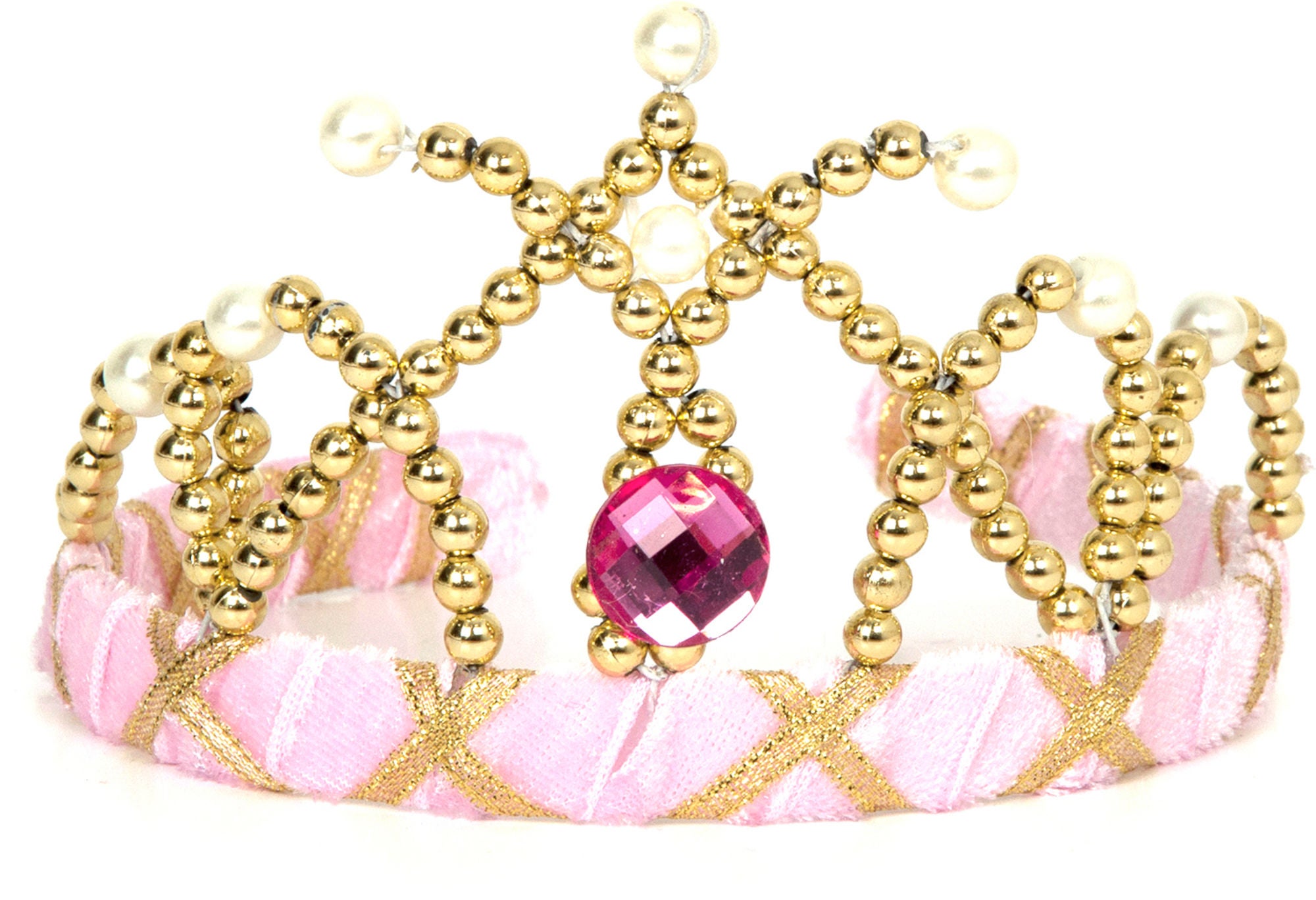 En rigtig fin tiara til den lille prinsesse fra Den Goda Fen. Tiaraen er beklædt med fløjl og er dekoreret med guldperler, hvide perler og har en stor juvel i midten. Sidder perfekt på det lille hoved og kan bruges til både fastelavn, halloween eller bare når hverdagen trænger til en prinsesse. Passer til børn i alderen 3-7 år. Materialer: Polyester, plastik, metal.