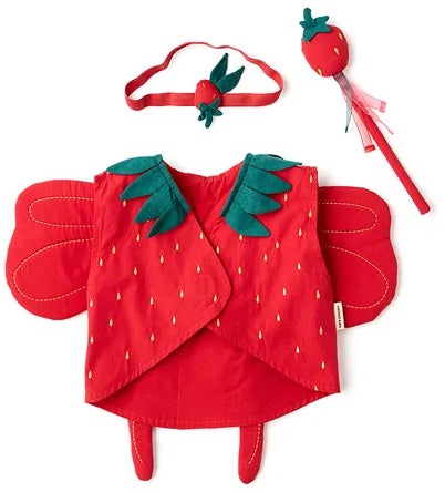 Kostume fra Kid's Concept med et sjovt design formet som et jordbær. Det har en fin vest og et hårbånd med en matchende tryllestav. Perfekt til timevis af fantasifuld leg. - Indeholder: 1 vest med vinger, 1 hårbånd med et dekorativt jordbær, 1 tryllestav. - Meget let at tage på og af. - Stimulerer dit barns kreativitet. - Anbefalet alder: Fra 3 år. - Økologisk bomuld, genanvendt polyester.