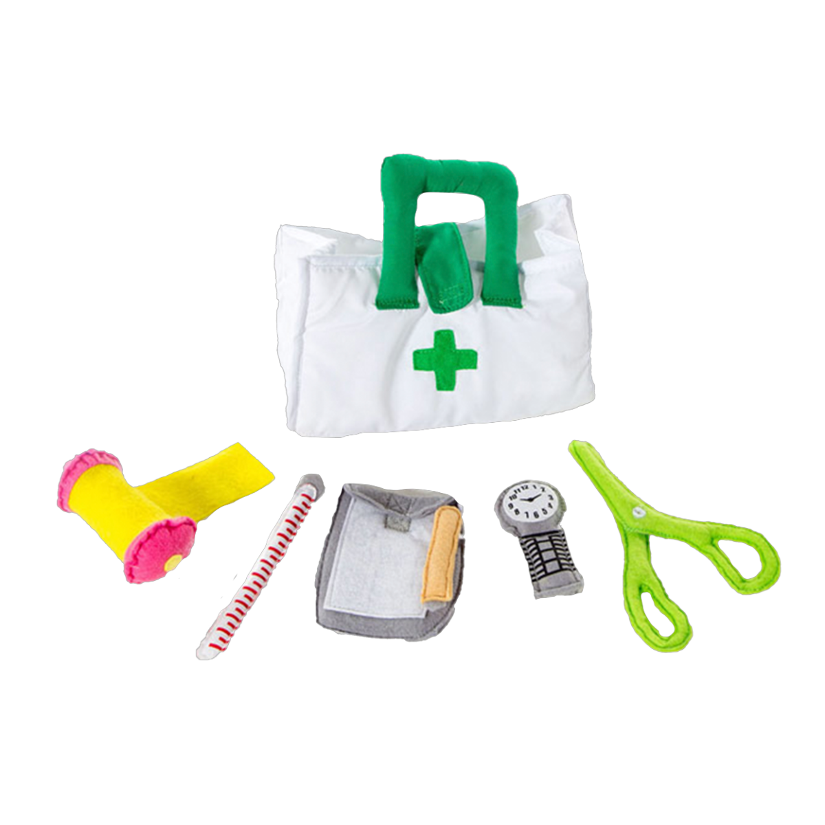Hvis du ikke er så glad for at give dit barn en rigtig reflekshammer, så er dette kit en rigtig god ide. Her er de vigtigste sygepleje-redskaber i tekstil, som også kan vaskes på skåneprogram i maskinen. Taske, ur, reflekshammer, termometer, saks og en plaster-beholder.