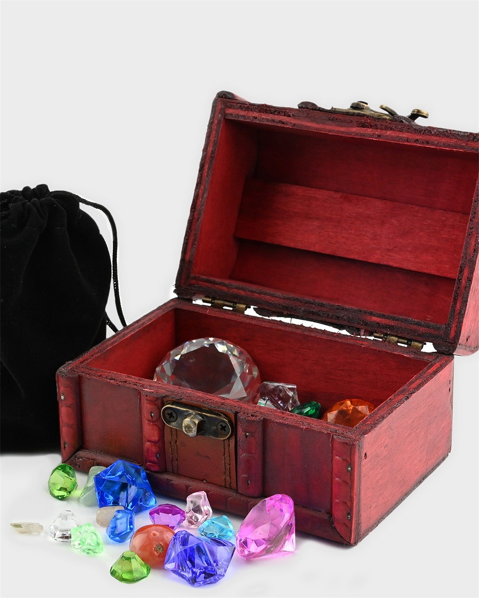 Kalder alle landkrabber. Her kan ungerne finde piratens seje gamle tręskattekiste. Måske er den pręmien i en sjov skattejagt? Skattekisten er 12 cm bred og både 8 cm i hųjde og dybde og har metallukning. Og så er den fuld af diamanter og flotte sten og en velourpose de kan ligge i.