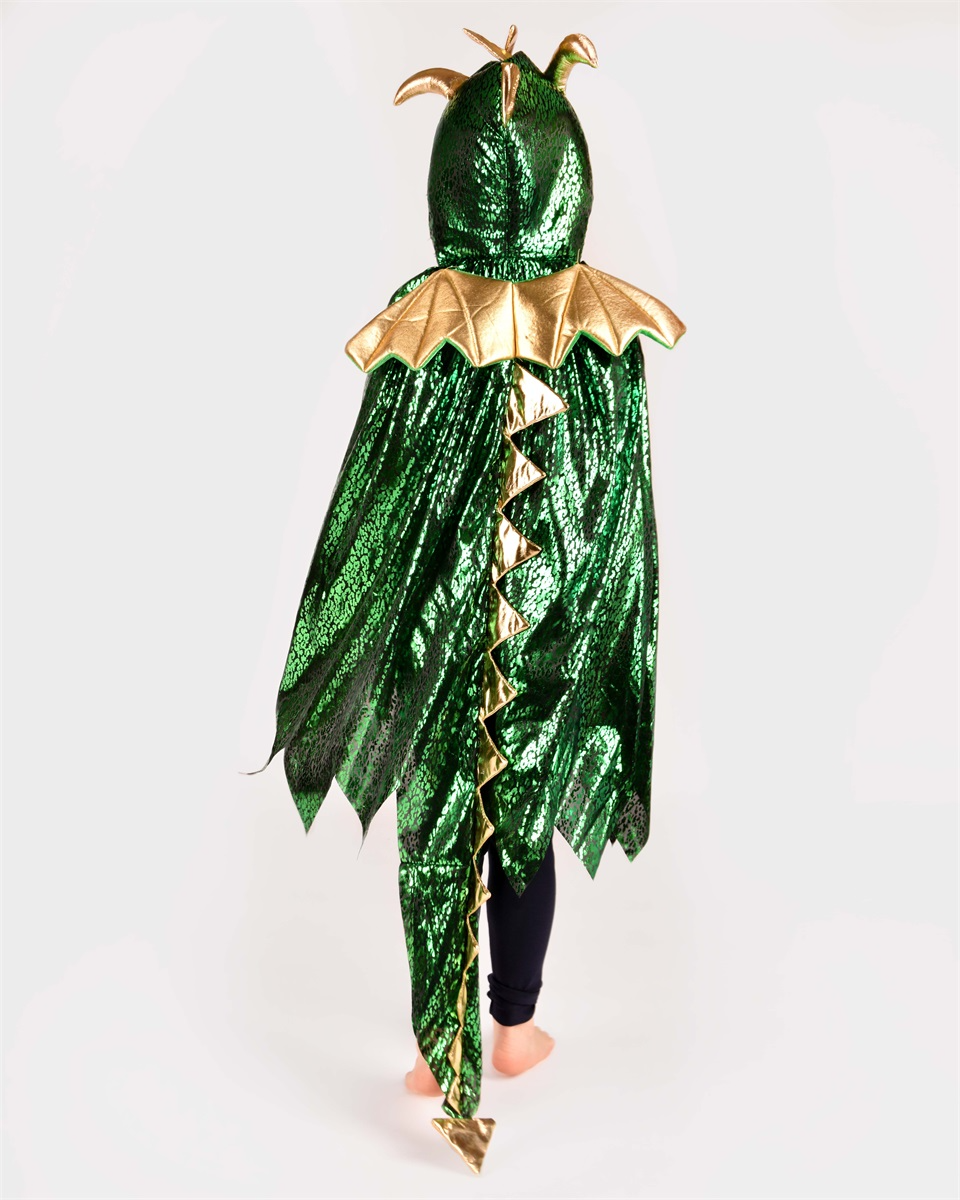 Børn har mange skøre og fantastiske dagdrømme. Nogle drømmer om at blive store og mægtige troldmænd eller troldkvinder - andres drømme går i retning af heltemodige riddere, der beskytter kongeriger eller prinsesserne, der bor på de store flotte slotte.Men måske dit barn er anderledes? For måske går dagdrømmerierne i retning af at være den store og ildspyende drage, der ødelægger slotte, hamstrer guld og flyver fra landsby til landsby og spreder frygt?En drage kan selvfølgelig også være helt ufarlig - sød, mild, søvnig, hjælpsom og legesyg, som den magiske Puff fra en vis berømt børnesang.Hvad enten det er den ene eller anden type drage, der manifesterer sig i jeres hjem, når der skal leges udklædningsleg og rolleleg, har vi det helt rette dragekostume!Denne kappe vil gøre din lille drage klar til eventyr uanset om kalenderen melder om fastelavn, Halloween eller ganske almindelig hverdag. Den glitrende grønne dragekappe er udstyret med skønne detaljer, bl.a. en lang hale, gule takker langs ryggen, små fine vinger og polstrede horn, og den vil få dit barn til at føle, at han/hun kan flyve højt over skyerne.Hvis du har lyst til at give dit barn mange magiske og eventyrlige stunder i udklædningens tegn, bør denne dragekappe uden tvivl få en plads i kommoden. Men pas på - før du ved af det, vil din lille ankelbider måske forvandle sig til en glubsk, grøn, ildspyende drage.Vi advarer derfor på forhånd om, at det godt kan virke en smule skræmmende, når du ved aftentid skal informere din lille drage om, at det er sovetid. Men det skal nok gå - overvej evt. at tage lidt guldmønter med - det burde have en beroligende effekt på dragen :-)Materiale: Polyester. Vaskeanvisning: Håndvask 30° C. Måske ikke komme i tørretumbler og må ikke stryges.