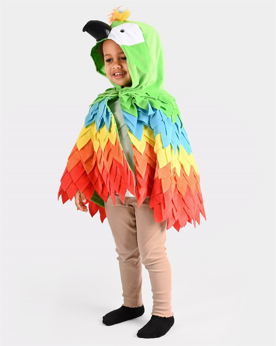 Som papegøje kan dit barn flakse rundt i junglen eller sidde på skulderen af søens værste sørøverkaptajn og råbe Der er ål i mine strømper eller Så er gode dyr rådne, gå planken ud eller du må kløjs i dine galosher, din usle knurhane.Meget fin kappe, der lukkes under hagen.