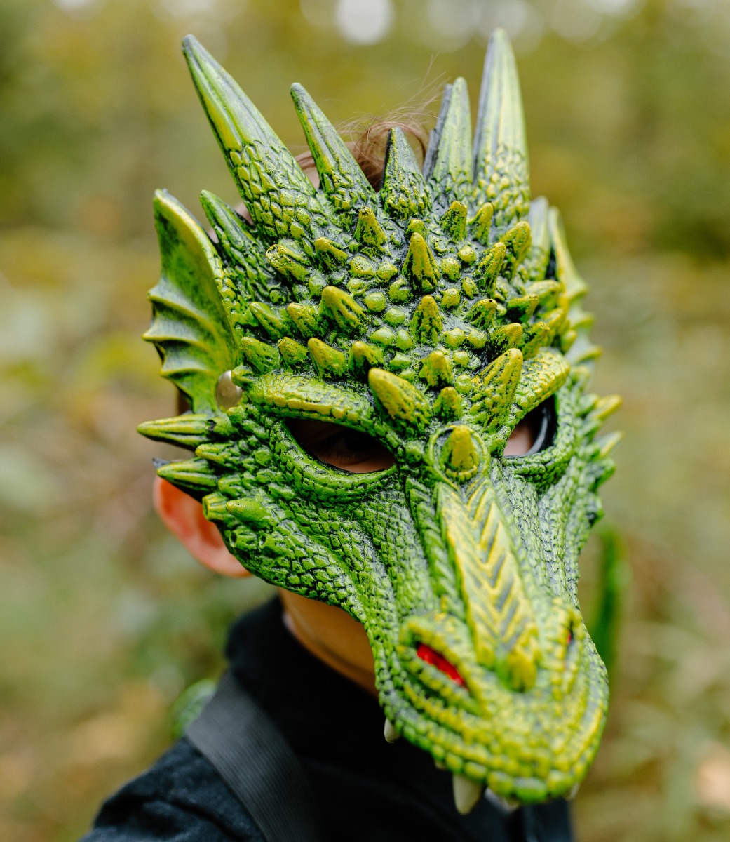 Uhyggeligt flot dragemaske af skum med gummi udenpå, så den virker helt ægte og både er behagelig at have på og kan holde til at blive brugt.Med rem som kan justeres, så masken både passer den 3-årige og den 7-8 årige. Desværre kan voksne ikke passe den - så du kan ikke bruge den til at skræmme livet af unger, der ringer på din dør til halloween.