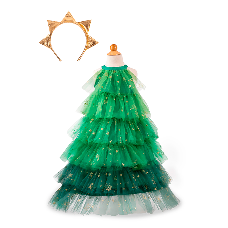 Her kan dit barn blive forvandlet til det mest søde og bløde juletræ med masser af grønt tyl og fine glimmer-gulddetaljer og en stjerne på toppen i form af en hårbøjle. Der er bøjle inde i kjolen så den holder formen og ikke hænger som et skævt juletræ.Tåler en tur i vaskemaskinen men ikke nogen tur i tørretumbleren.Oplagt gave til decembers festlige dage, til fastelavn eller til dit juleglade barn, som tæller ned til den 24.12 hele året.
