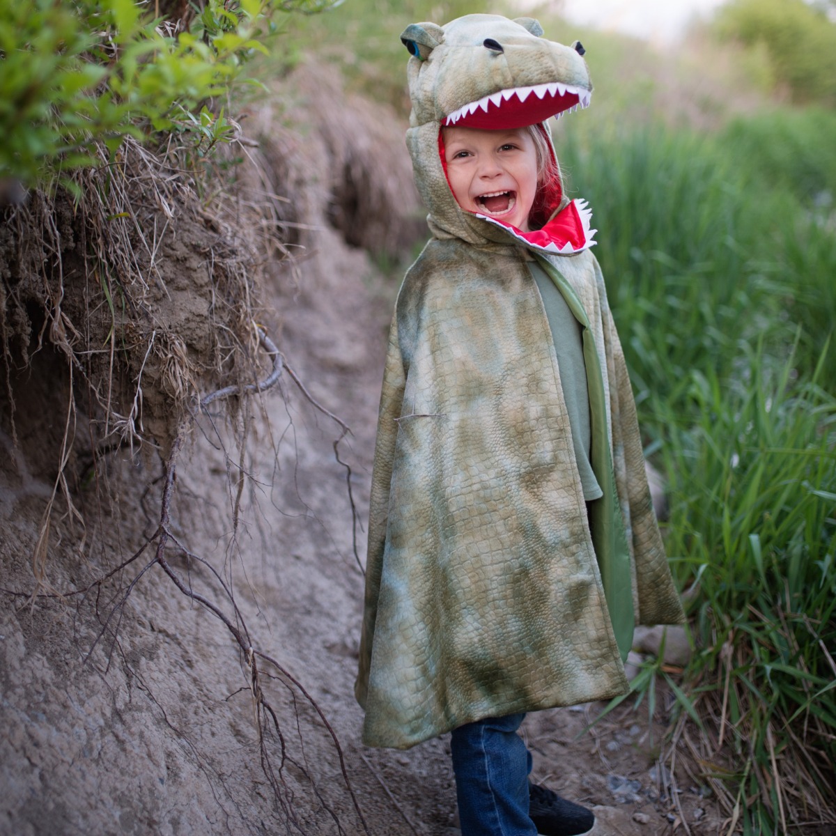 Denne praktiske og behagelige kappe med tilhørende klør i form af ærmer og et mundstykke, der kan tages af, gør det til en leg at forvandle sig til en drabelig fortidsdino med smag for små og store skabninger. Både små og store søskende skal bare passe på!
