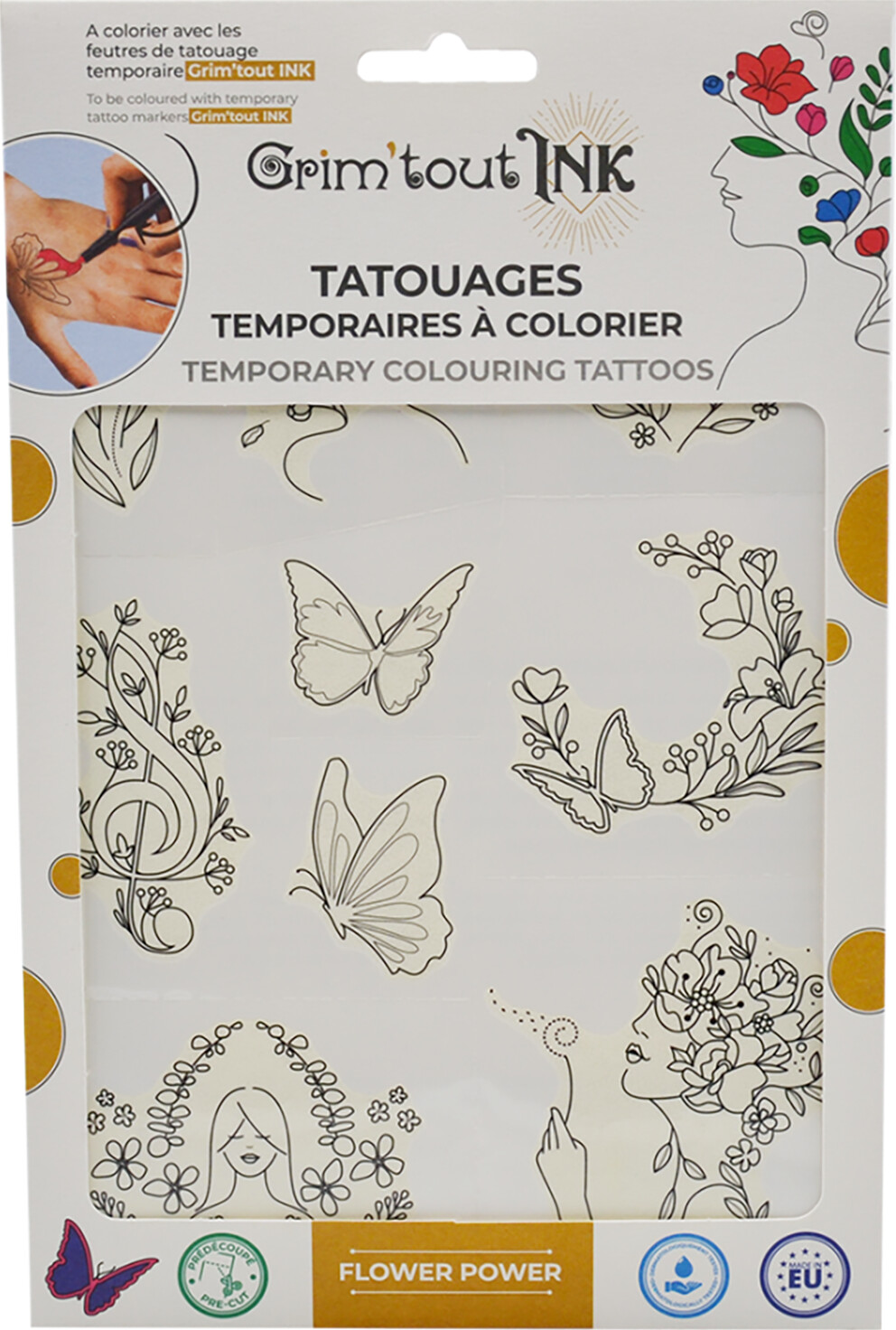 Flower Power tatoveringsskabeloner er designet til kreativ sjov, så børn selv kan farvelægge dem...