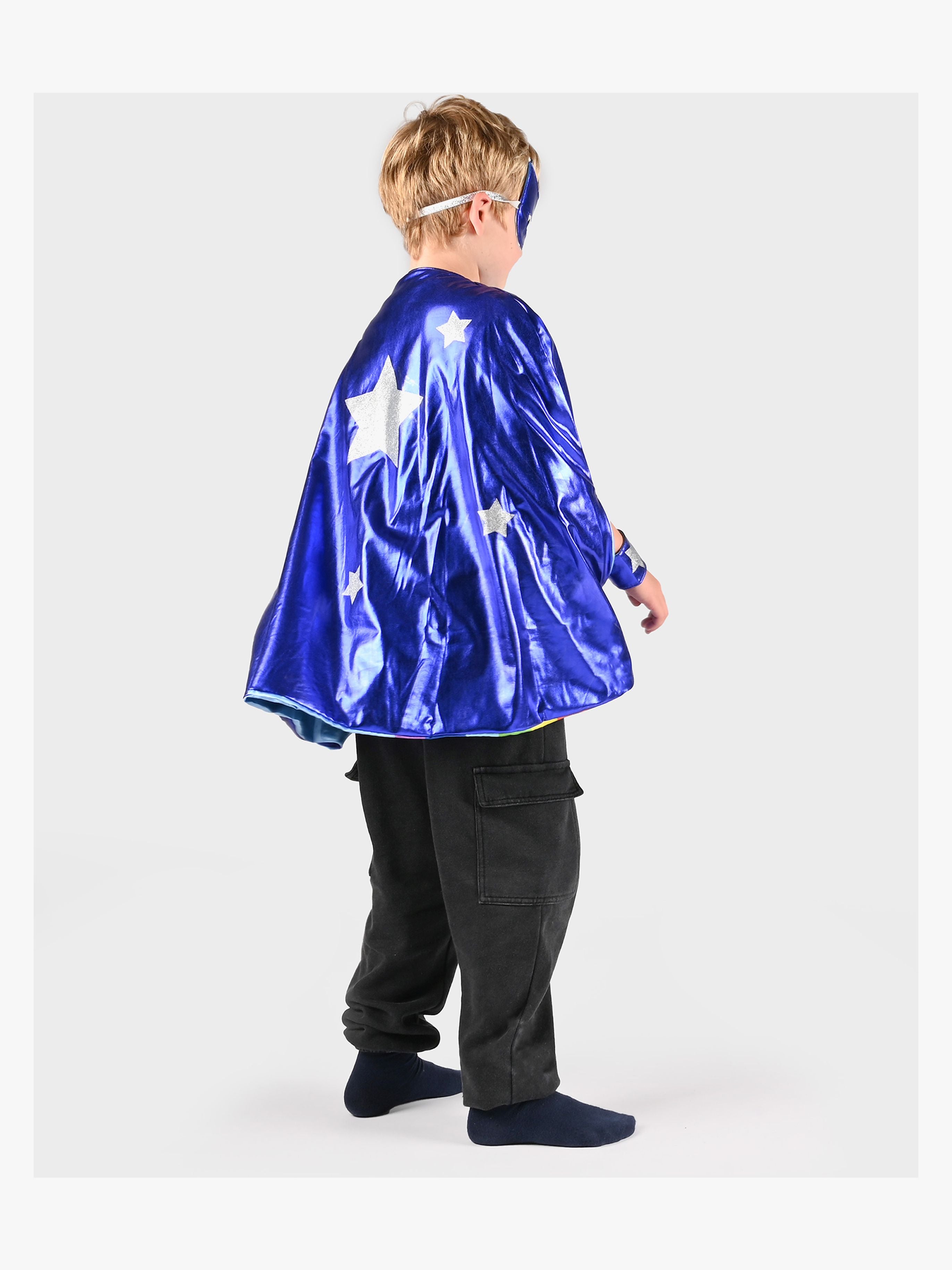 Vendbar kappe fra Den Goda Fen med et farverigt design. Den har en matchende øjenmaske og to armbånd. Perfekt til udklædning og rolleleg. - Indeholder: 1 kappe, 1 øjenmaske, 2 armbånd. - Maske med elastik. - Åbninger til arme. - Velcrolukning i nakken. - Både kappe og tilbehør er vendbare. - Perfekt til fantasifulde eventyr. - CE-mærket. - Anbefalet alder: Fra 2 år. - 100 % polyester.