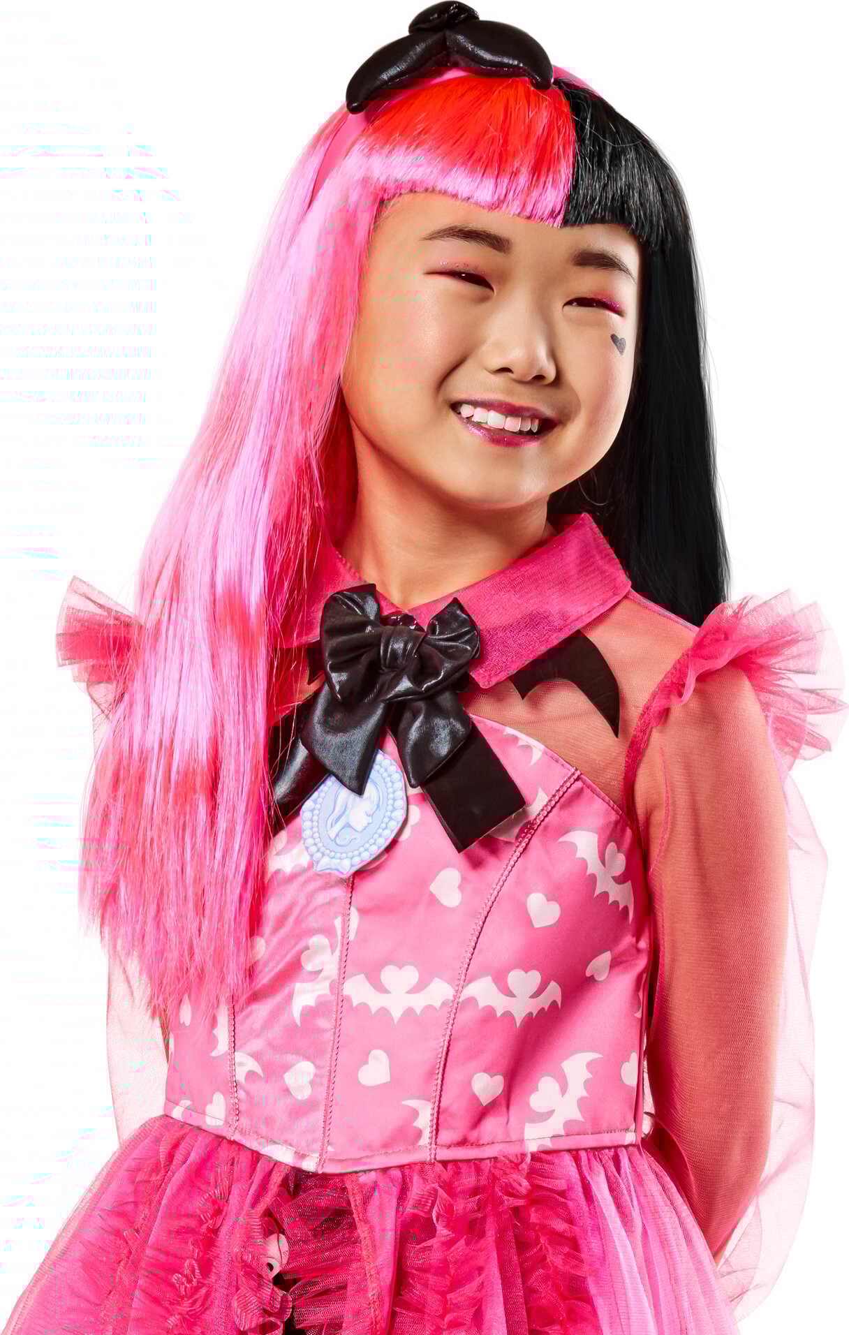 Gør dig klar til at blive centrum for opmærksomheden med denne stilfulde og iøjnefaldende peruk, der helt sikkert vil imponere dine venner og familie. Med Rubies' Monster High peruk, kan du nemt træde ind i Draculaura's verden og blive en del af det magiske eventyr!