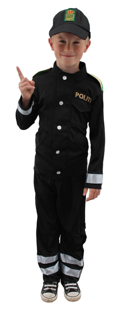 Politidragt str. 3-4 år. Indeholder jakke, bukser samt kasket.