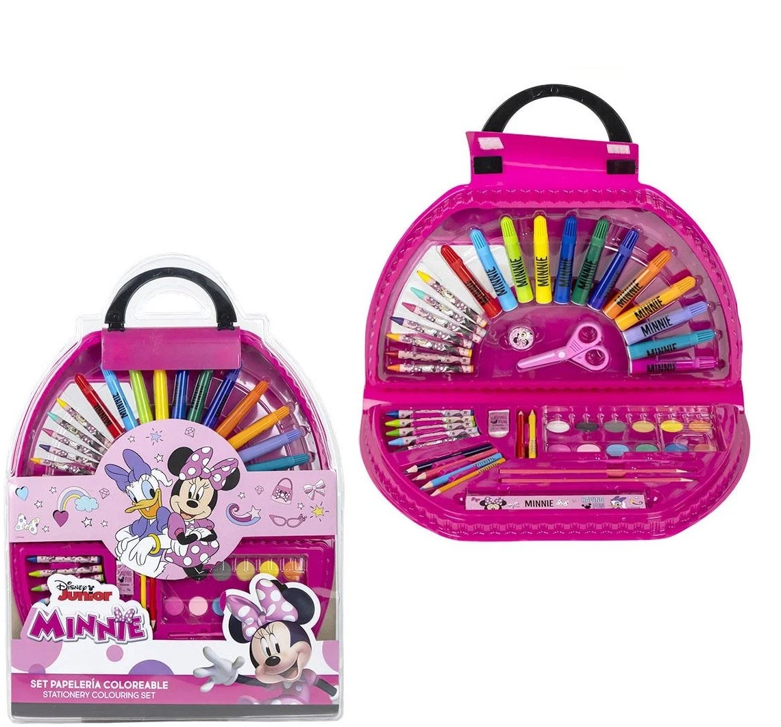 Malesæt fra Disney Minnie Mouse med 50 maletilbehør med et sødt tema. Perfekt til kreative aktiviteter. - Indeholder: 12 filttusser, 12 farvekridt, 6 farveblyanter, 2 blyanter, 1 viskelæder, 1 blyantspidser, 1 lineal, 1 saks, 12 vandfarver. - Praktisk håndtag. - Flot design. - Perfekt at tage med på udflugter og ture til dit barn. - CE-mærket. - Anbefalet alder: Fra 2 år. - Plastik.