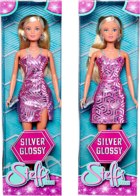 Steffi Love dukken iført en sølv og pink blank kjole. Modedukken kommer med hæle, håndtaske og øreringe, som alt sammen matcher! Specifikationer:  Velegnet til børn fra 4 år og derover. Kun...