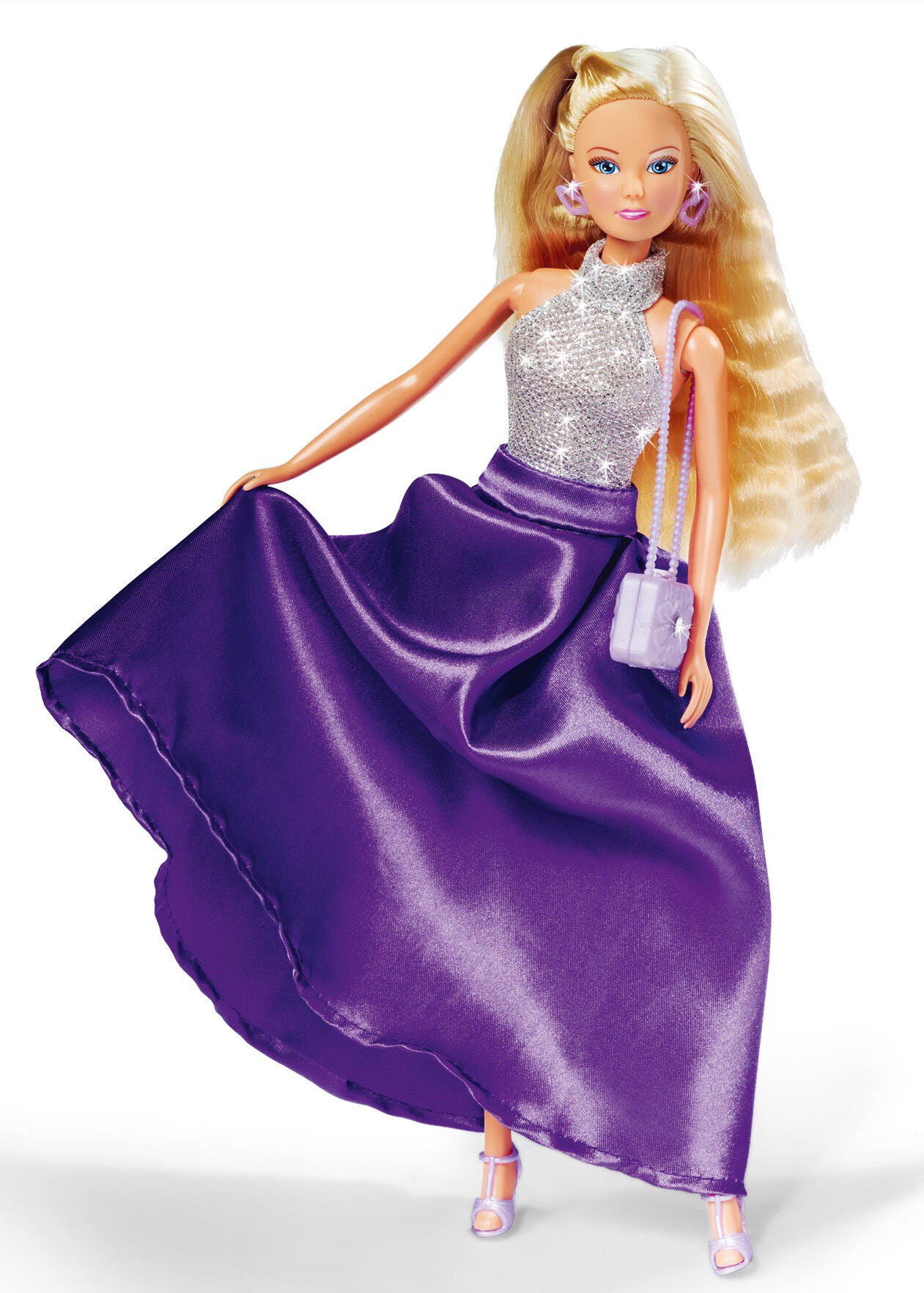 Dukke fra Steffi Love med en glamourøs aftenkjole med en glitrende overdel og en lilla nederdel i silke. Den har hjerteformede øreringe og højhælede sko. Dukken har en skinnende skuldertaske. Perfekt til timevis af fantasifuld leg. CE-mærket. Indeholder: 1 dukke, 1 par sko, 1 par øreringe, 1 skuldertaske. Anbefalet alder: Fra 3 år. Plastik, polyester.