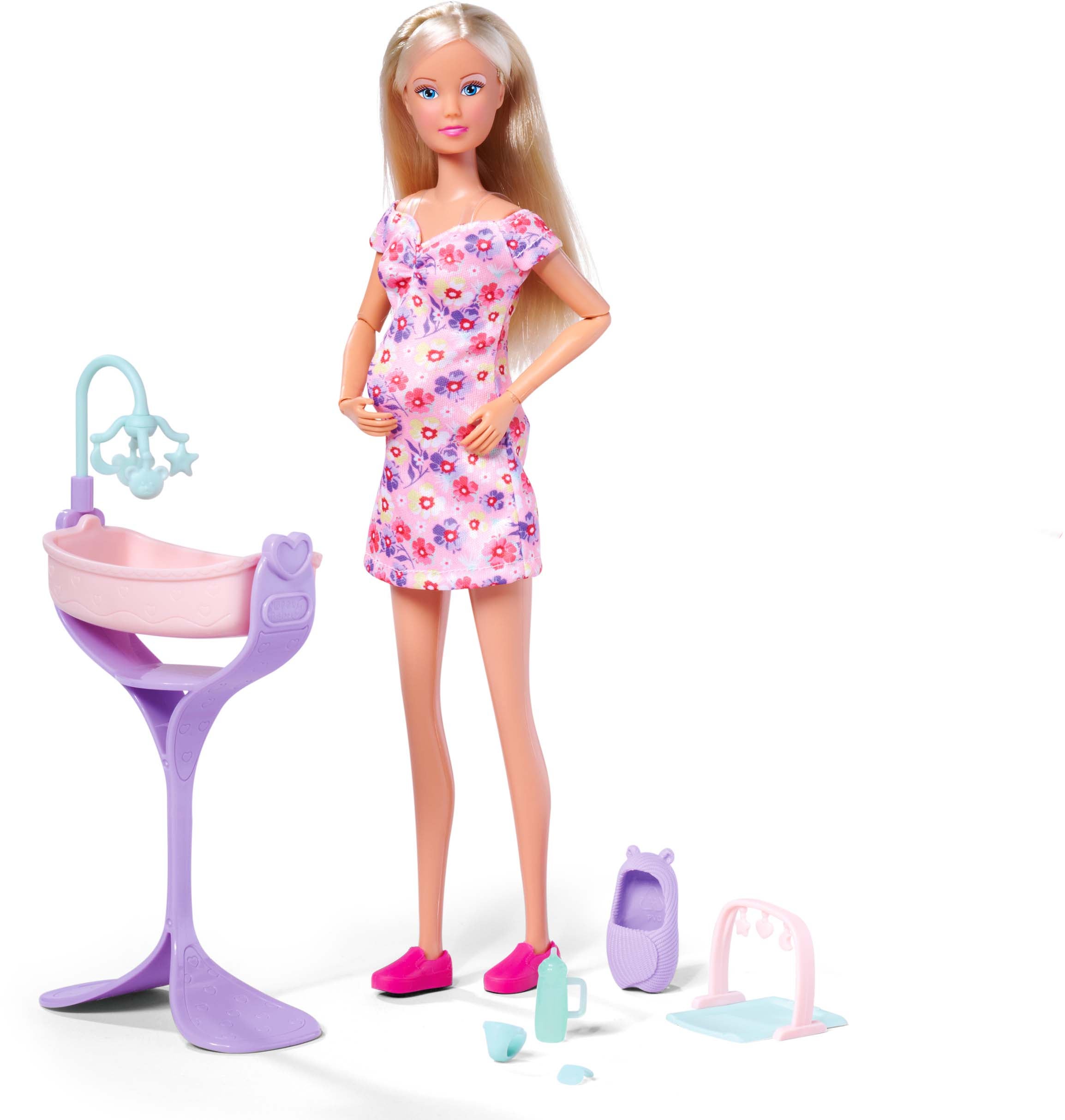 Gravid dukke fra Steffi Love med en voksende mave og andet tilbehør. Perfekt til mange timers sjov. - Dukkesæt med Steffi, den glade og forventningsfulde mor. - Gravid mave, der vokser hver dag. - Flere forskellige tilbehør medfølger, fx en hyggelig krybbe og en legemåtte. - Babyen medfølger også. - CE-mærket. - Anbefalet alder: Fra 3 år. - Plastik.
