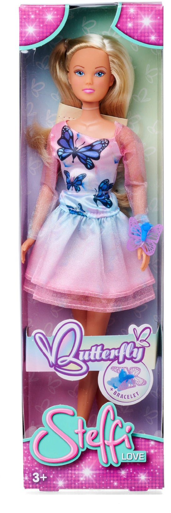 Dukke fra Steffi LOVE med en fin sommerfuglekjole med et matchende armbånd. Perfekt til timevis af fantasifuld leg. - Steffi-dukken er 29 cm høj. - Der medfølger et flot sommerfuglearmbånd. - Saml på alle produkterne i serien. - CE-mærket. - Anbefalet alder: Fra 3 år. - Plastik.