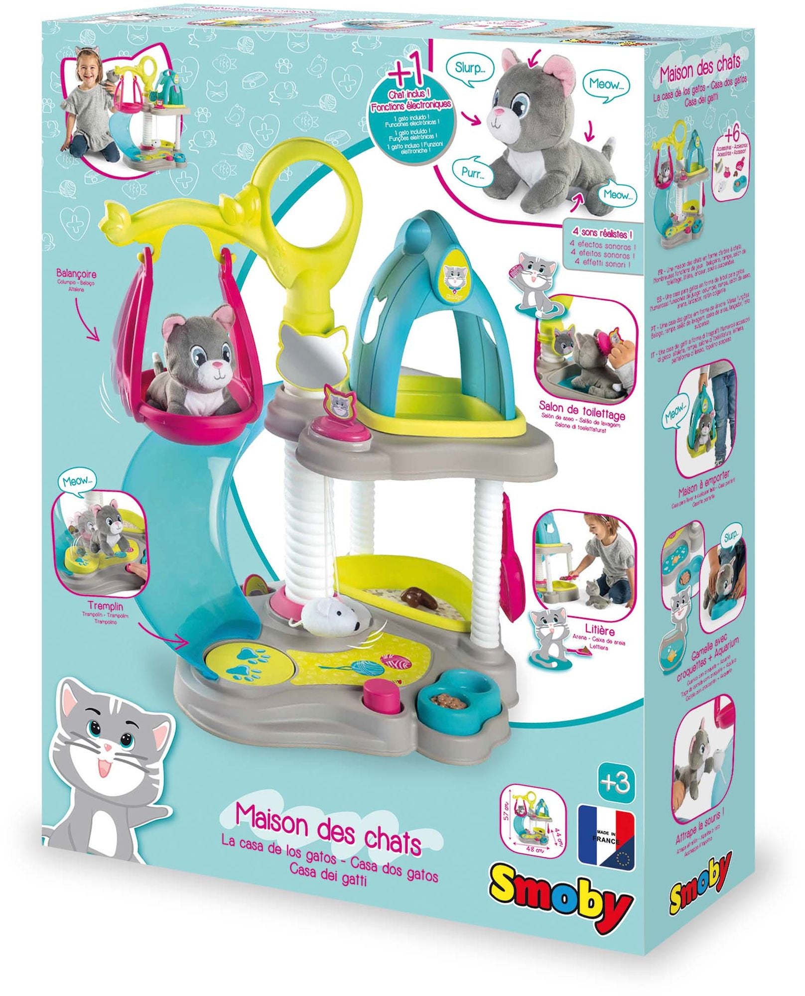 Sød kat med hus og masser af tilbehør fra Smoby. Legetøj med forskellige funktioner. Lad din kat lege, spise og bare have det hyggeligt. Kræver 3 stk. AG13-batterier (medfølger). Anbefalet alder: Fra 3 år.