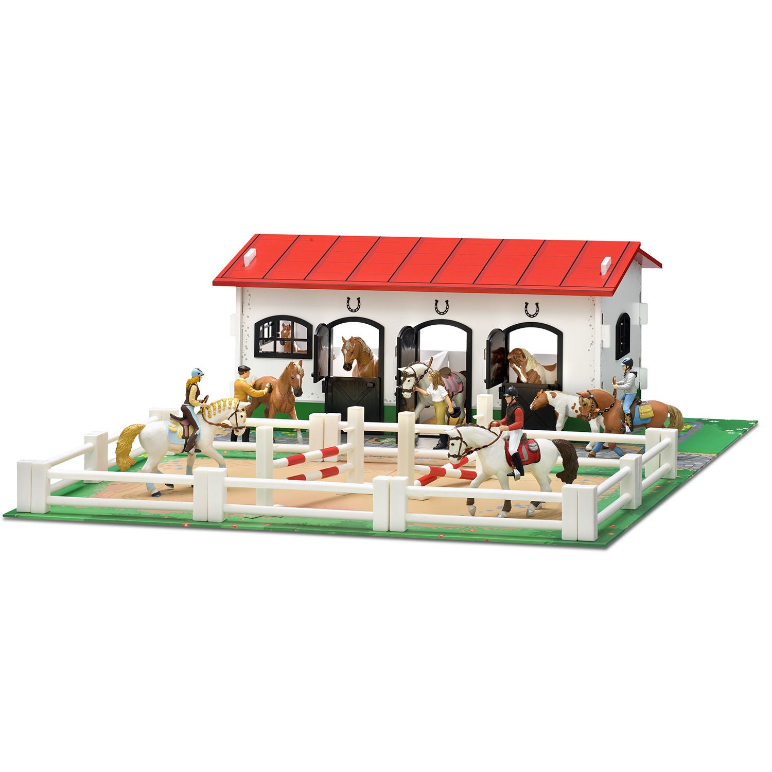 Stald m. hestefold fra Micki - en legestald i et slidstærkt træmateriale med et praktisk underlag af pap. Stalden er let at folde sammen og pakke væk. Inde i stalden er der tre båse, som alle kan åbnes og lukkes. Pakken indeholder også to forhindringer til hestefolden og ti stk. hegn. Obs! Figurer er ikke inkluderet. Mål: 75 x 59 x 22 cm. Anbefalet alder: Fra 3 år. Materiale: Træ. Underlag af slidstærk pap.