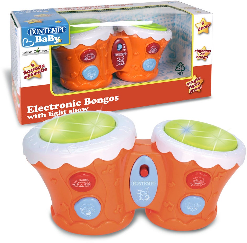 Elektronisk bongotromme fra Bontempi. Perfekt til den lille musikant. - 6 forindspillede melodier. - Lys- og lydeffekter. - Volumenkontrol. - Let for små hænder at gribe om. - Fremmer musikalsk engagement. - CE-mærket. - Anbefalet alder: Fra 1,5 år. - Batterier medfølger ikke.