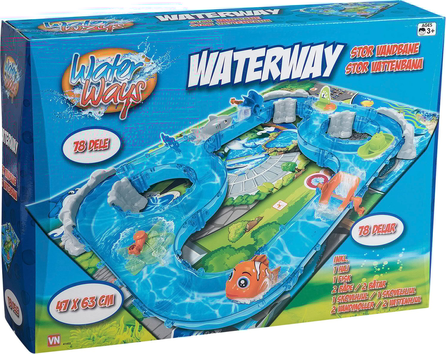 Waterways stor vandbane Komplet med skovlhjul, 2 både, 2 vandmųller, fisk og haj 63x47 cm 78 dele