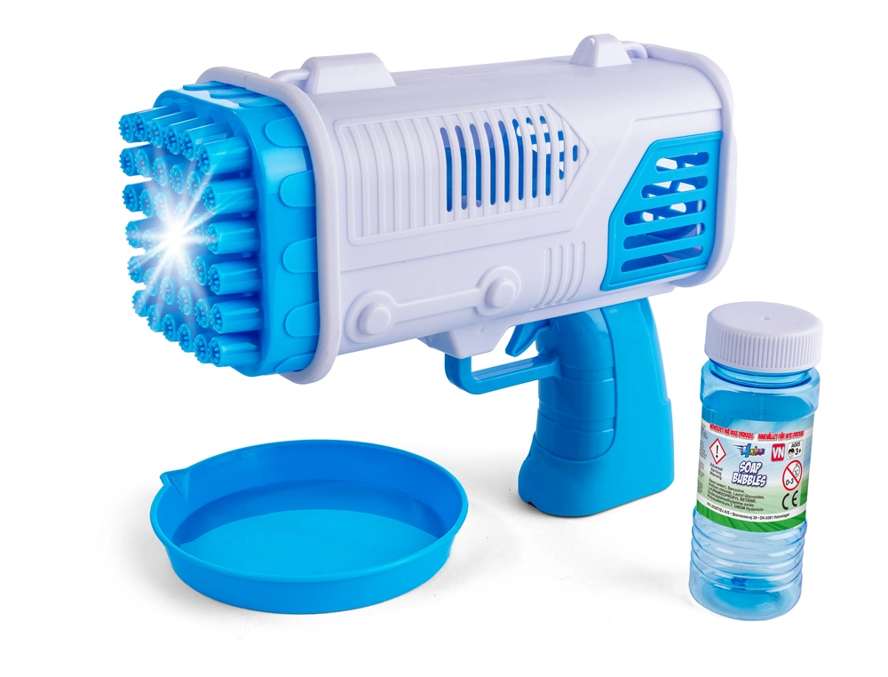 4KIDS Batteridrevet sæbeboblepistol med 36 huller. Inkl. kar og tube med sæbeboblevand. Excl. 4 stk. AA-batterier