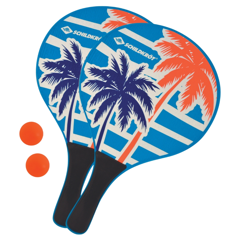 Strandtennis-bat af træ med håndtag af skridsikker plast, som giver et godt greb.Der følger to bat og to bolde af plast med, så I har en ekstra, hvis den første bliver væk. I praktisk genlukkelig pose.