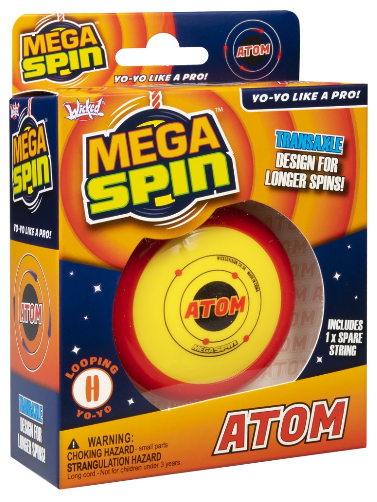 Produceret af Wicked, som har produceret aktiv, originalt og innovativt legetøj i over 20 år. Deres Booma serie er produceret i England. Uanset om du vil 'Rock the Baby' eller 'Walk the Dog', er Mega Spin Atom yo-yo med dets glatte transakseldesign en fan
