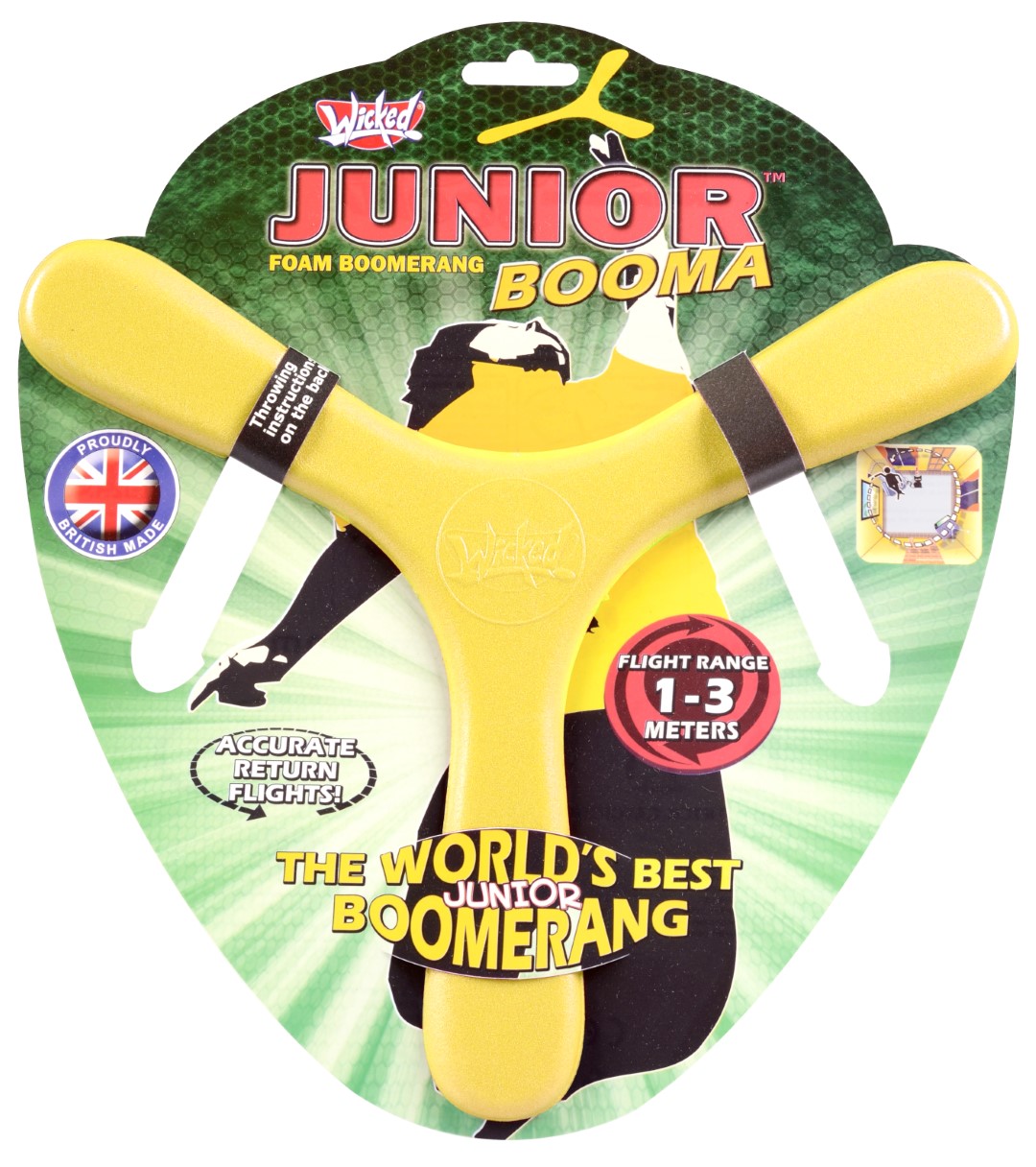 Produceret af Wicked, som har produceret aktiv, originalt og innovativt legetøj i over 20 år. Deres Booma serie er produceret i England. Med en flyverækkevidde på 1-3 meter giver Wicked Junior Booma dig mulighed for at kaste og fange som en professionel i