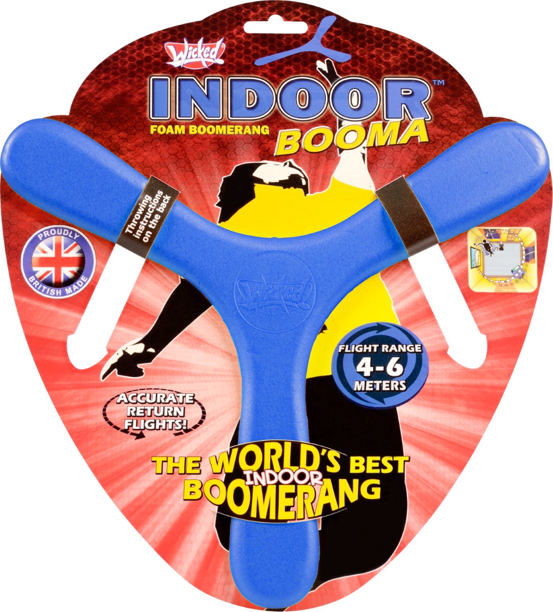 Produceret af Wicked, som har produceret aktiv, originalt og innovativt legetøj i over 20 år. Deres Booma serie er produceret i England. Med en flyverækkevidde på 4-6 meter giver Wicked Indoor Booma dig mulighed for at kaste og fange som en professionel i