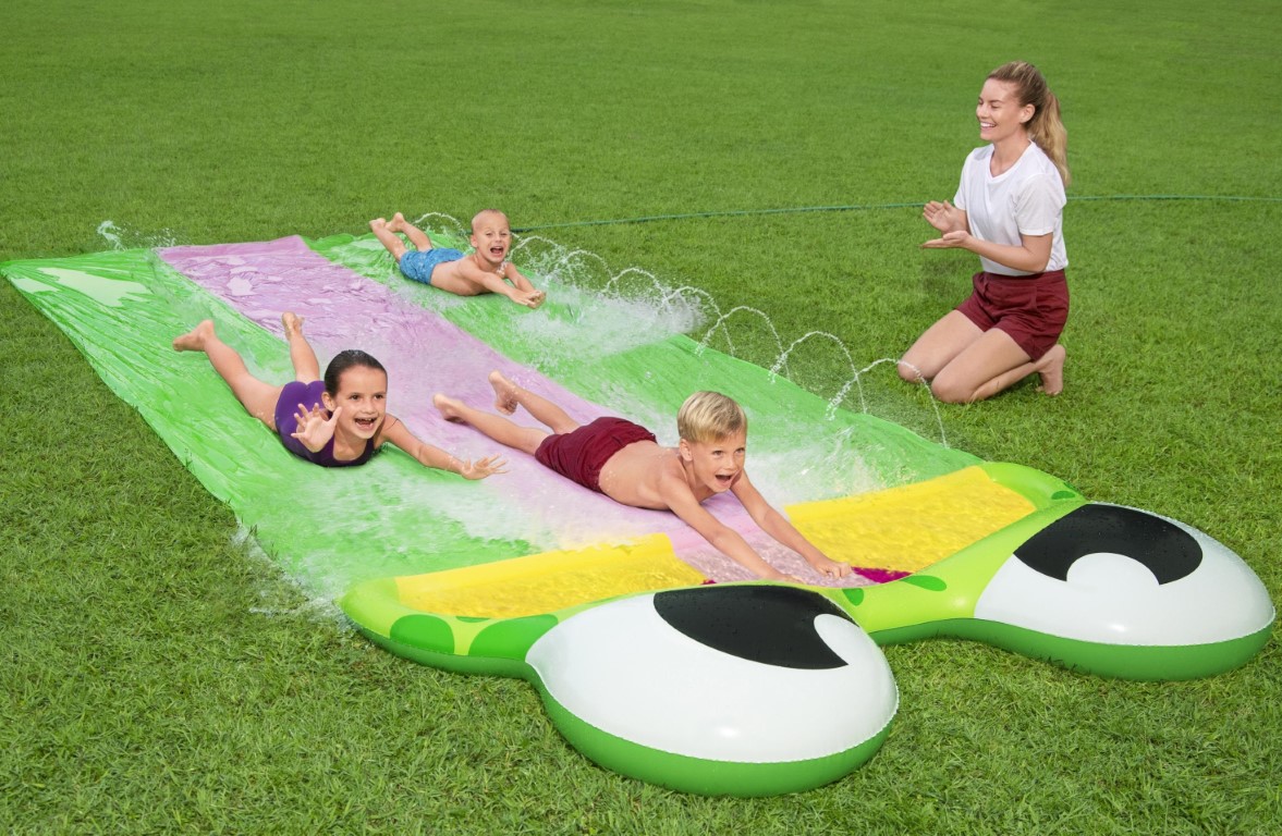 Tre baner er perfekt til ræs eller grupper Fyld det indvendige bassinkammer med vand for at opnå ekstra stabilitet Indbyggede sprinklere giver kaskadeeffekt og holder banerne glatte Et vandgangsbassin giver en landing med et højt plask Sæt adapteren på en