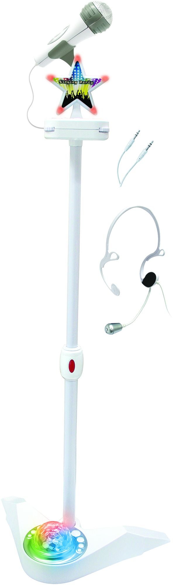 Byd på sang med dette sjove diskosæt med to karaokemikrofoner fra Cloudberry Castle. Mikrofonstativet har et aftageligt lydsystem med en håndholdt mikrofon, en headsetmikrofon og blinkende lamper. Lydsystemet kobles let til en smartphone og kan kobles til begge mikrofoner samtidigt, så du kan synge med din ven. Lydsystemet har en smartphoneholder, og mikrofonstativet kan justeres i højden. Funktioner: - 4 indbyggede rytmer - 3 forskellige lydeffekter - Aftageligt lydsystem med 2 mikrofoner og blinkende lamper. - Smartphone-holder. - Mikrofonstativets højde kan justeres til 65-100 cm. - CE-mærket. Anbefalet alder: Fra 3 år.