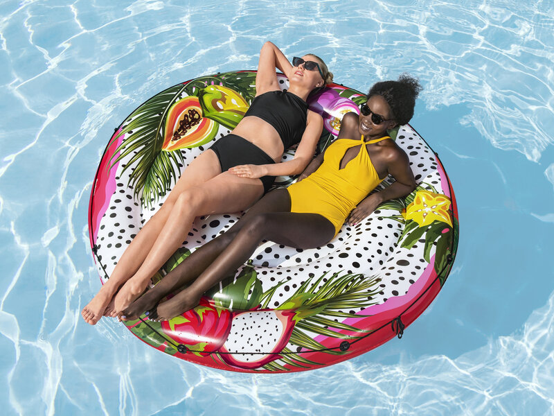 Er du klar til at tage din afslapning til havs, eller i det mindste til den lokale sø? Tag din bedste ven, partner eller nabo med og driv væk på denne store bademadras med tropiske frugter!