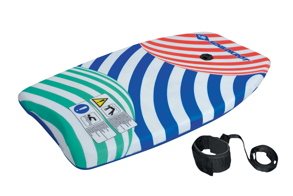 Vejer 320 gram og har en fin størrelse til at give dit barn suftoplevelser ved stranden. Også god til leg i pool eller svømmehal. Kommer med en 90 cm snor, hvormed du kan fastgøre svømmebrættet til håndleddet eller om foden. Det er ikke meget sjov ved at se sit bodyboard blive taget af bølgerne ved fralandsvind. En kerne af EPS-skum (polystyren som er udvidet med luft) giver en god opdrift. Og yderst er der en nylon-overflade. Til børn op til 60 kilo.