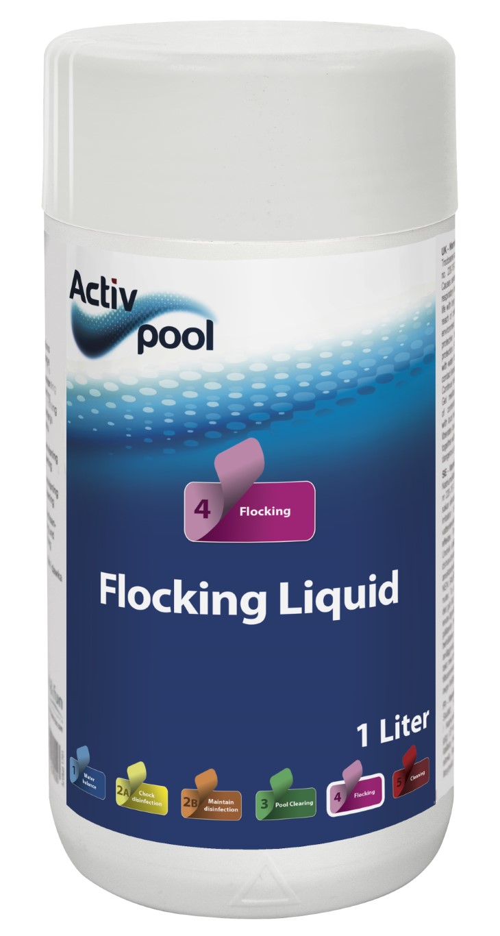 Activ Pool Flocking Liquid gør uklart poolvand klart igen ved at samle meget små svævende uklarheder i større enheder, der nu bedre kan opfanges af poolens sandfilter. I bassiner uden sandfilter vil uklarhederne i stedet bundfælde sig. Dosering: Justér fø