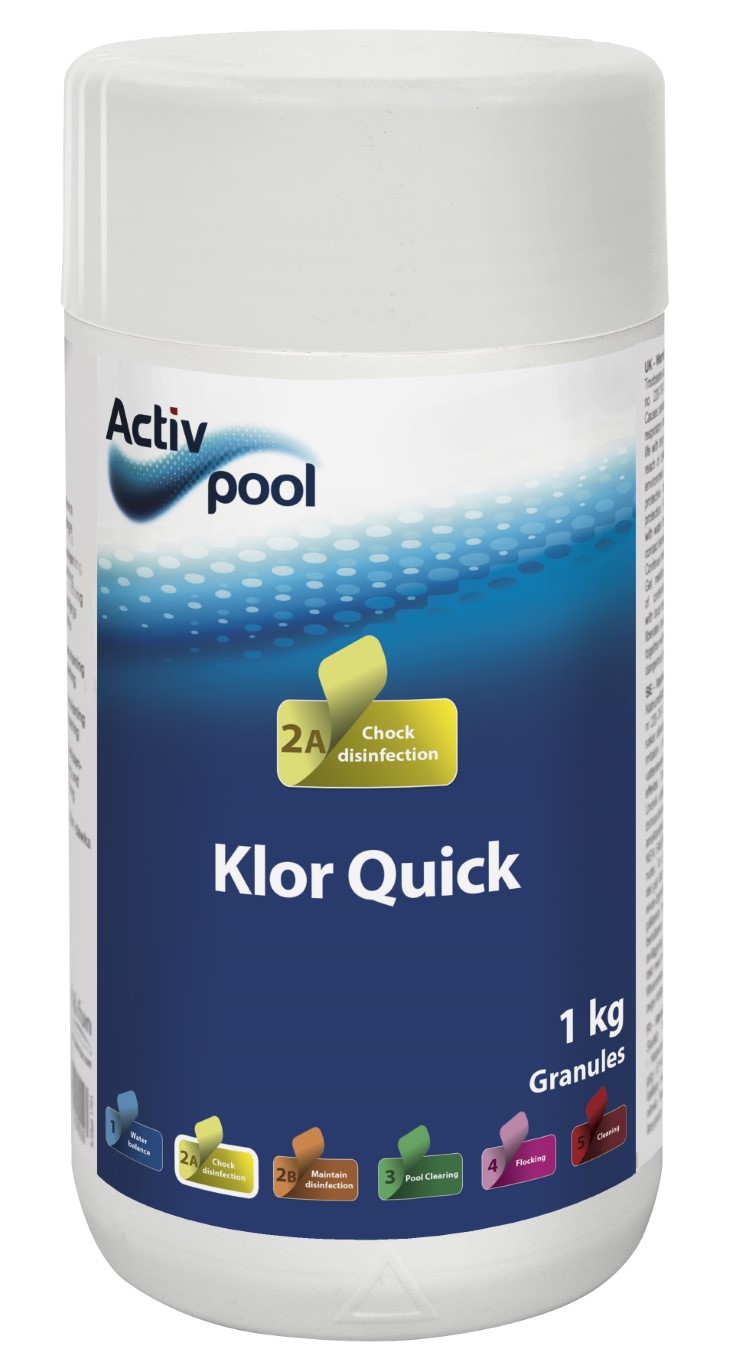 Activ Pool Klor Quick anvendes til desinfektion af poolvand. Sikker desinfektion af badevandet i pools med høj aktivitet opnås ved at opretholde et klorindhold på 1-3 mg/l og en pH værdi mellem 7,0-7,4. Kontrollér og justér regelmæssigt klor og pH-niveaue