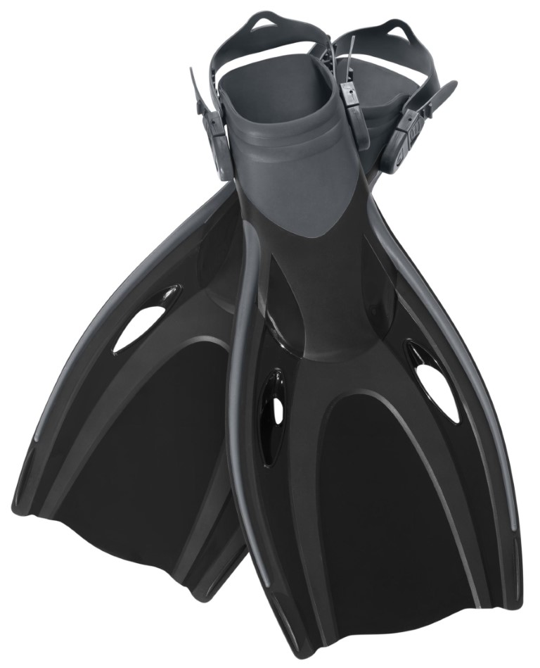 Bløde, komforttestede finner størrelse EUR (37,5-41) US ( 5,5-8) Finnerne leveres med en et-tryks frigørelsesknap Fremdriftsstruktur med fleksibel finneblad sikrer virkning og kraft for hver svømmebevægelse Skridsikker struktur på finnens underside Bæreem