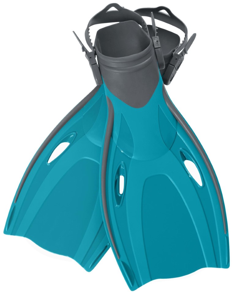 Størrelse: 43-48(EUR) Bløde, komforttestede finner Finnerne leveres med en et-tryks frigørelsesknap Fremdriftsstruktur med fleksibel finneblad sikrer virkning og kraft for hver svømmebevægelse' Skridsikker struktur på finnens underside Bæreemballage m