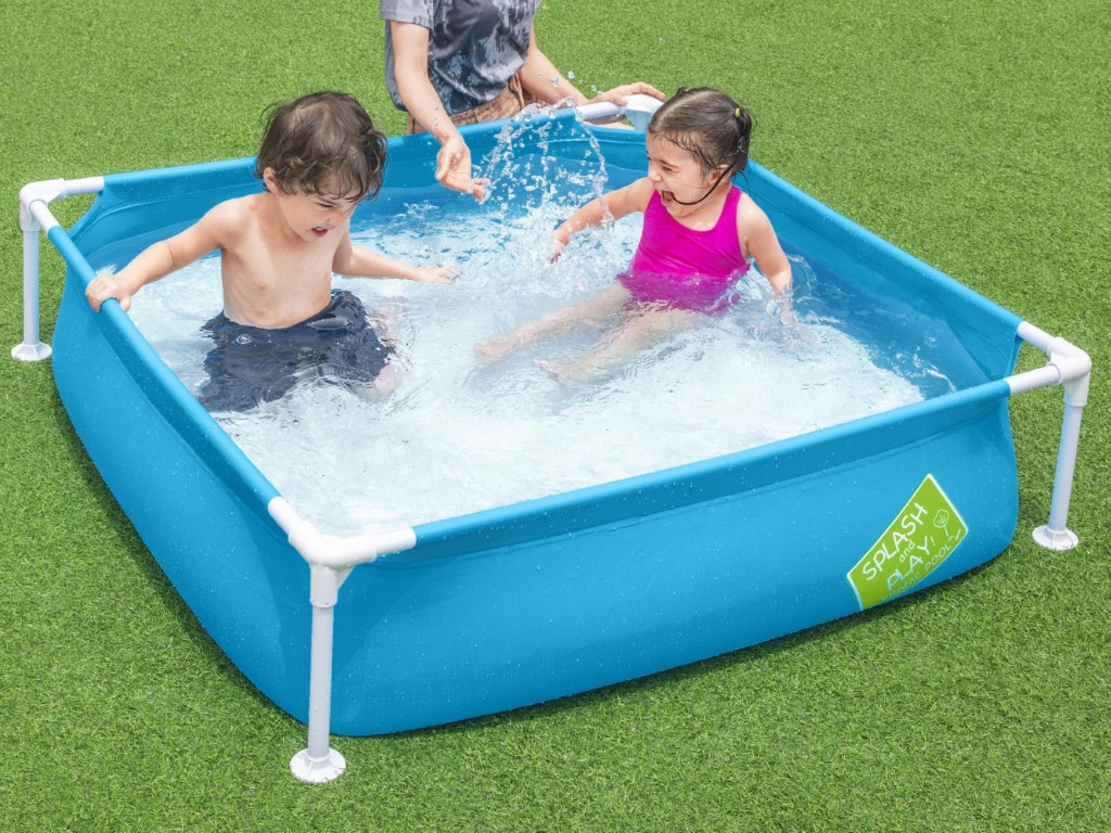 Simpel opsætning Korrosionsbestandige metalrammer Nem at tage ned til opbevaring uden for sæsonen Firkantet form giver mere plads til at svømme og lege Vandmængde (90%): 365L (96gal.) Selvklæbende reparationslap til undervandsbrug Indhold: Et bassin, repa