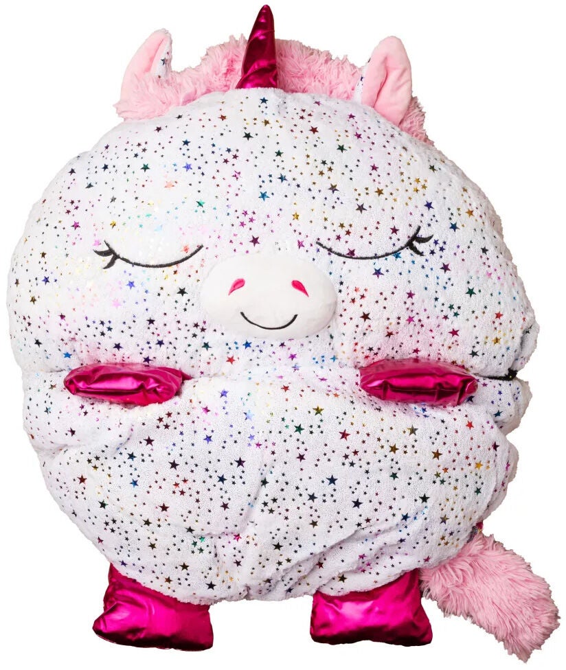 Bamse fra Happy Nappers som også fungerer som pude, legetæppe og sovepose med et glitrende enhjørningedesign. Den har fine påsyede detaljer og et praktisk bærehåndtag på toppen. Åbn trykknapperne på enhjørningen, og den kan foldes ud til en hyggelig sovepose. Perfekt til både leg og hygge. Soveposens længde: 167 cm. CE-mærket. Anbefalet alder: Fra 2 år. Polyester.