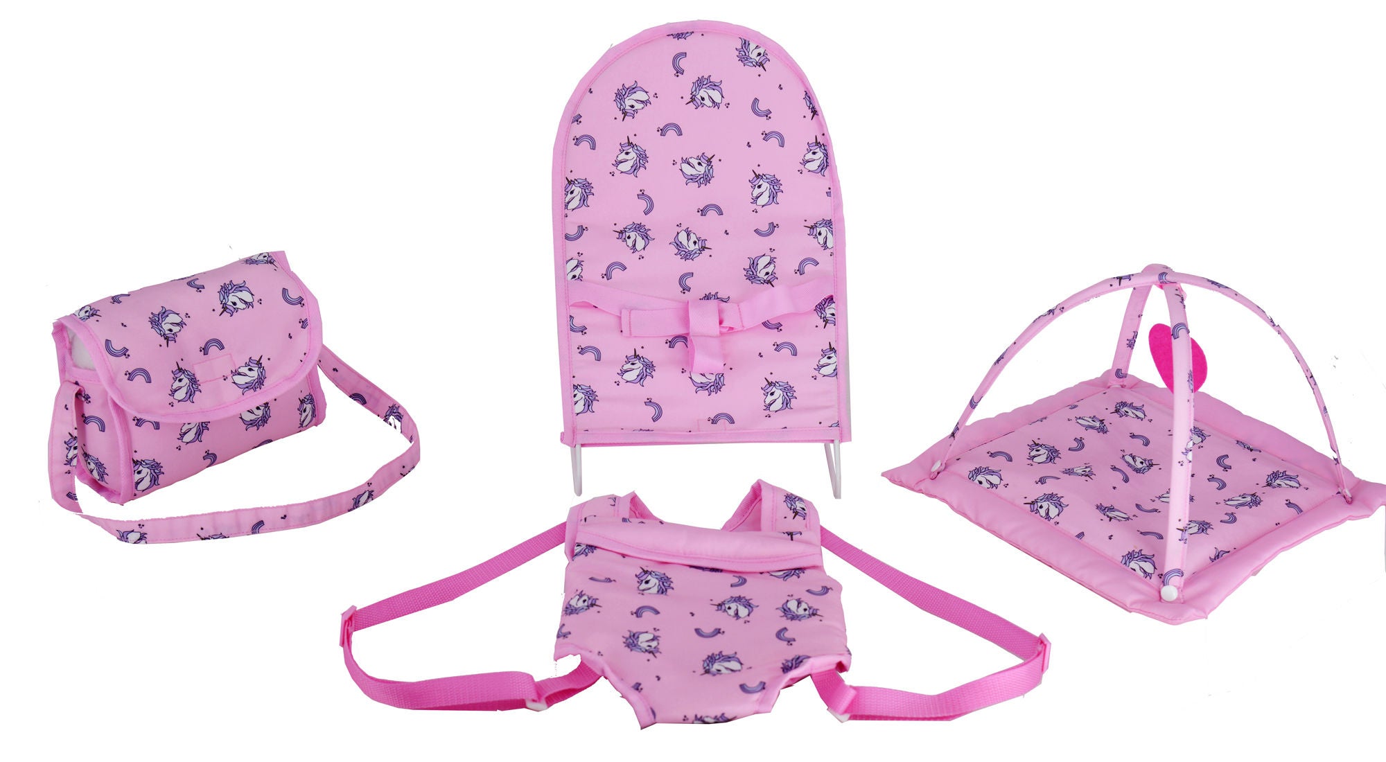 Et sæt med tilbehør til din dukke fra Clouberry Castle med et fint enhjørningsmønster. Der indgår skråstol, bæresele, aktivitetstæppe og en pusletaske, hvor du får plads til skiftetøj og andet dukketilbehør. Skråstolen er udstyret med en ramme i metal og en sele, der holder dukken på plads. Anbefalet alder: Fra 3 år