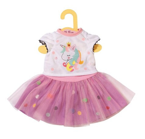 Dolly Moda Enhjørning Bluse og Tylskirt 39-46 cm Både BABY born, Baby Annabell og alle andre dukker i størrelse 39-46 bytte tøj så tosset, de vil. En drømmende enhjørning kigger ned fra den hvide t-shirt. Måske danser den gennem de farverige prikker, der