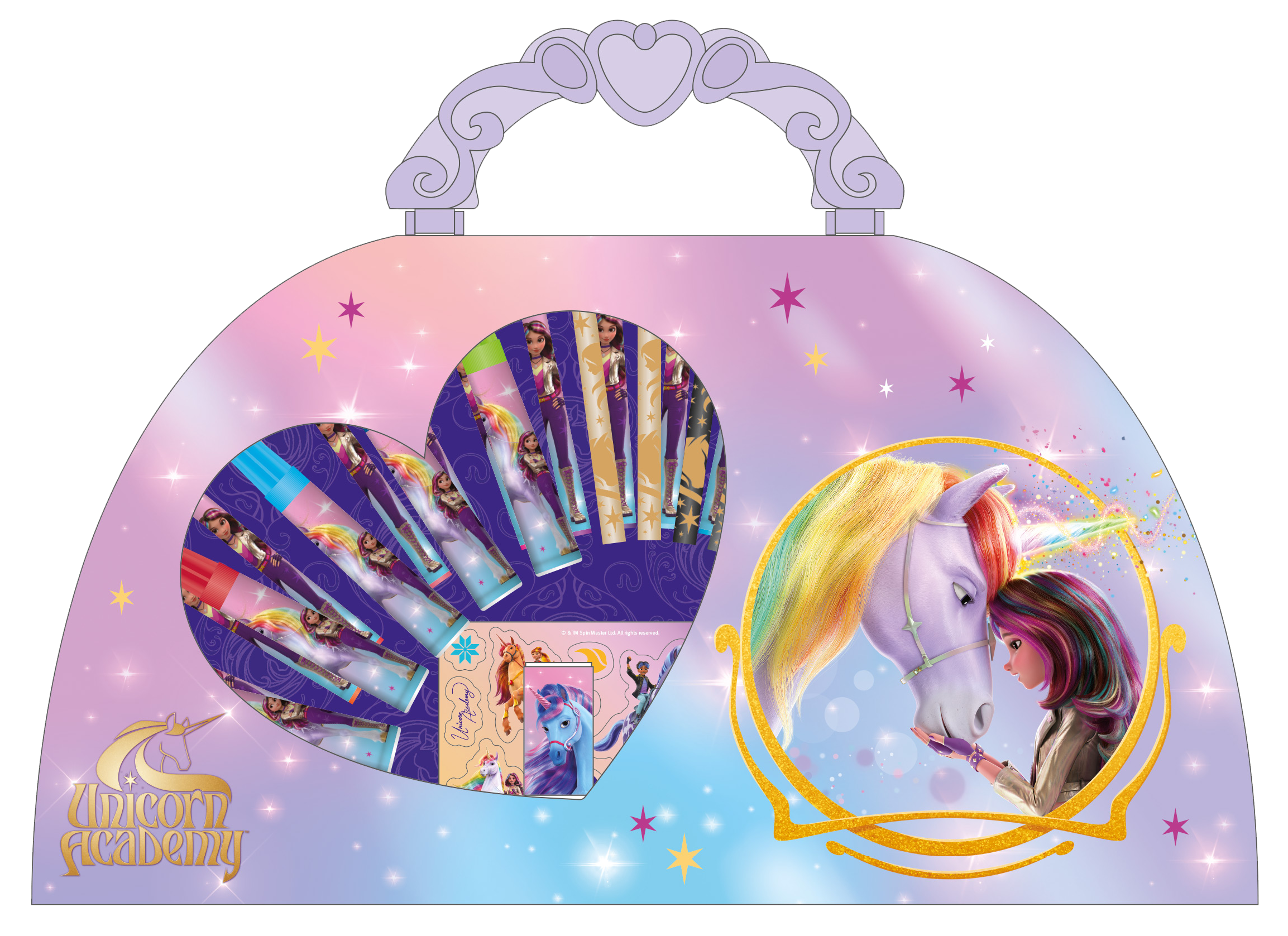 Halvmåneformet maletaske fra Unicorn Academy med 51 dele. Takket være håndtaget er tasken nem at have med overalt. Lad dit barn slippe kreativiteten løs med dette spændende sæt! - Indeholder: 12 små farveblyanter, 6 tusser, 24 farvekridt, 1 viskelæder, 2 minipenne, 1 blyantspidser, 1 klistermærkeark, 4 plakater. - Let at medbringe og opbevare! - Slip kreativiteten løs. - CE-mærket. - Anbefalet alder: Fra 3 år. - Karton, plastik.